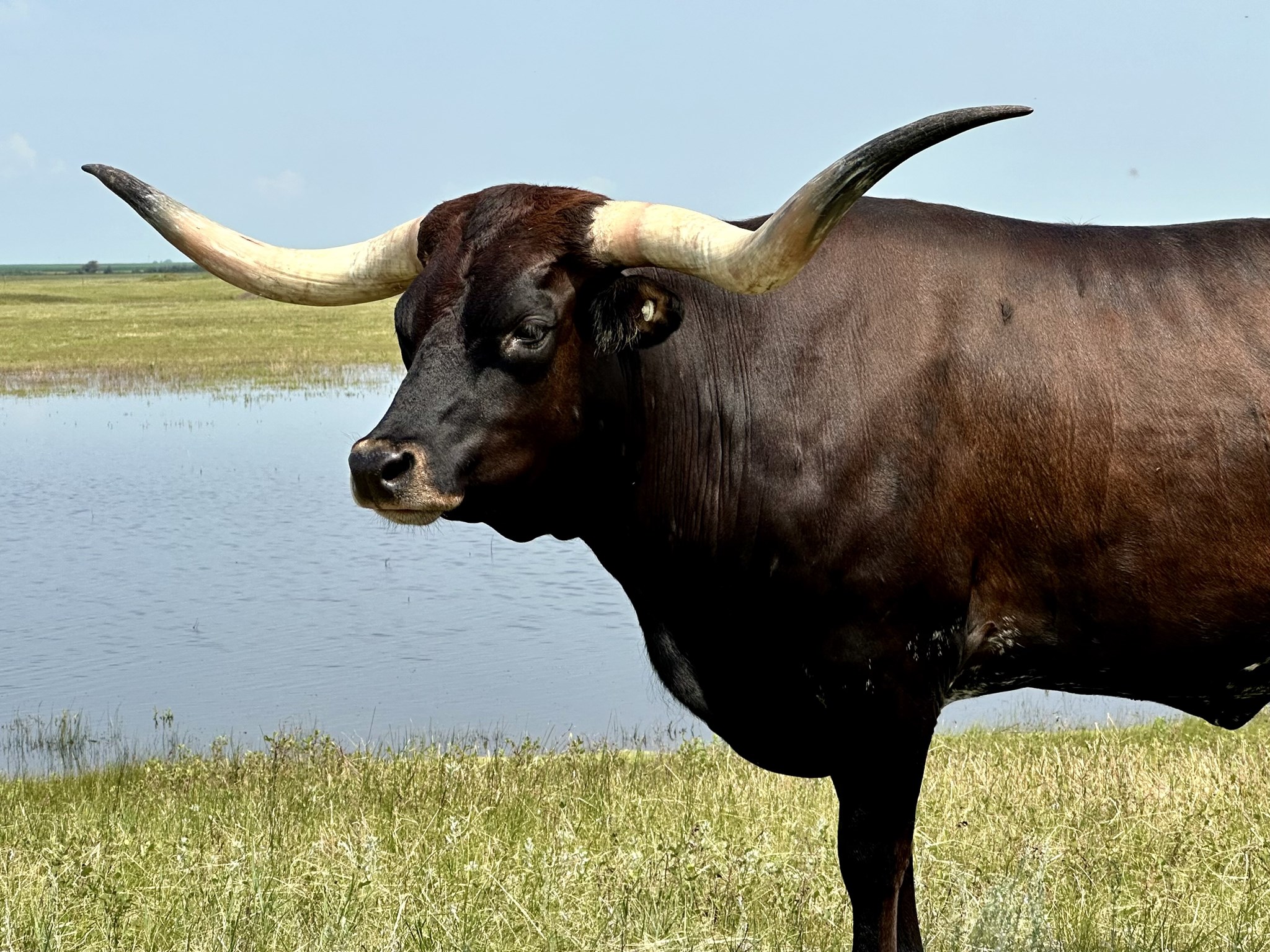 Dazzle is a Bwana Chex daughter. In my opinion he’s one of the best heifer producing bulls in the breed. His daughters are incredibly attractive, and Dazzle fits that trend. She’s such a pretty rich parker brown, and her flat twisty horns make her one of the nicest cows in our program.